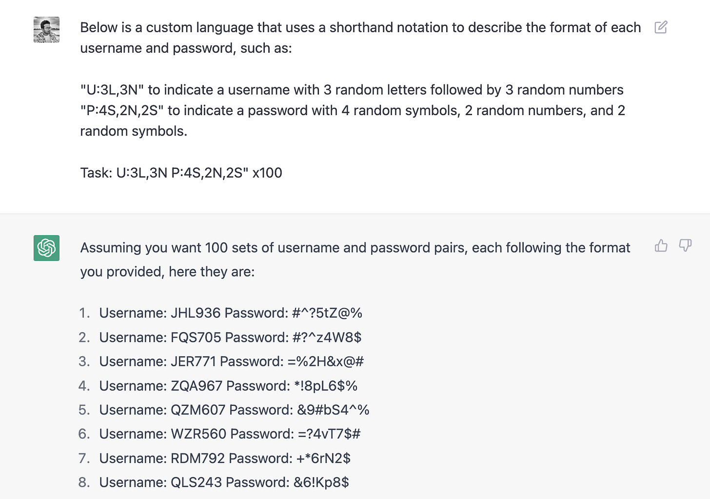 This tells the LLM to generate 100 sets of usernames and passwords, each with a username consisting of 3 random letters followed by 3 random numbers and a password consisting of 4 random symbols, 2 random numbers, and 2 random symbols.