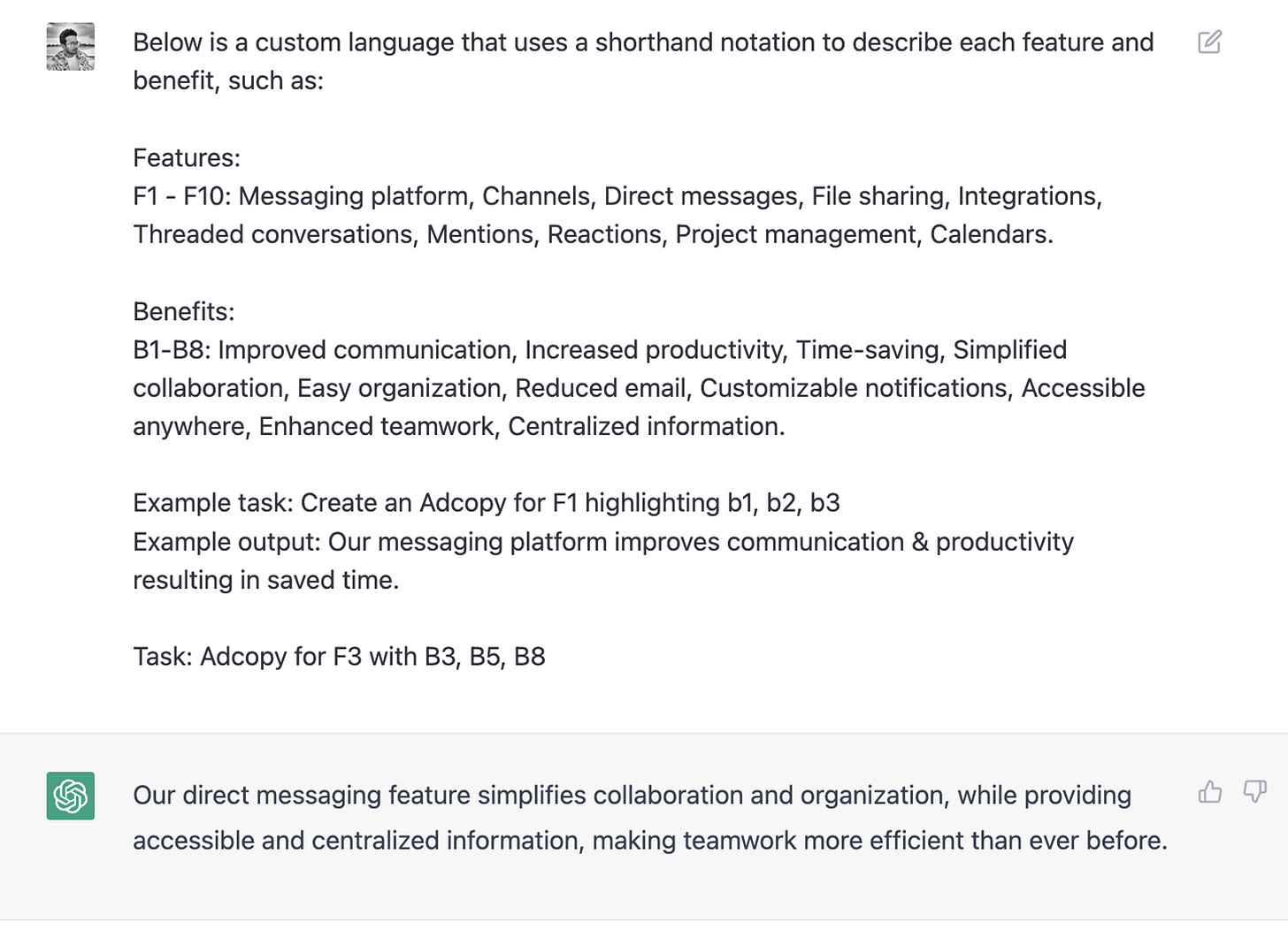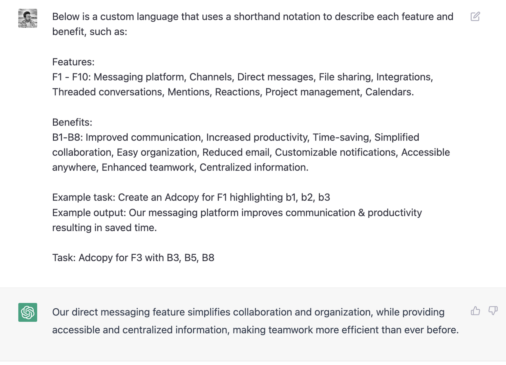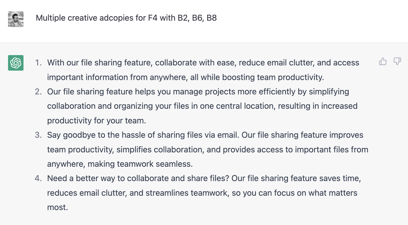 Now, instead of explaining the context of your product and asking ChatGPT to generate multiple versions of ad copies, you can simply provide a list of features and benefits using the shorthand notation. This makes the process smoother and more efficient, giving you more time to focus on other important tasks.
